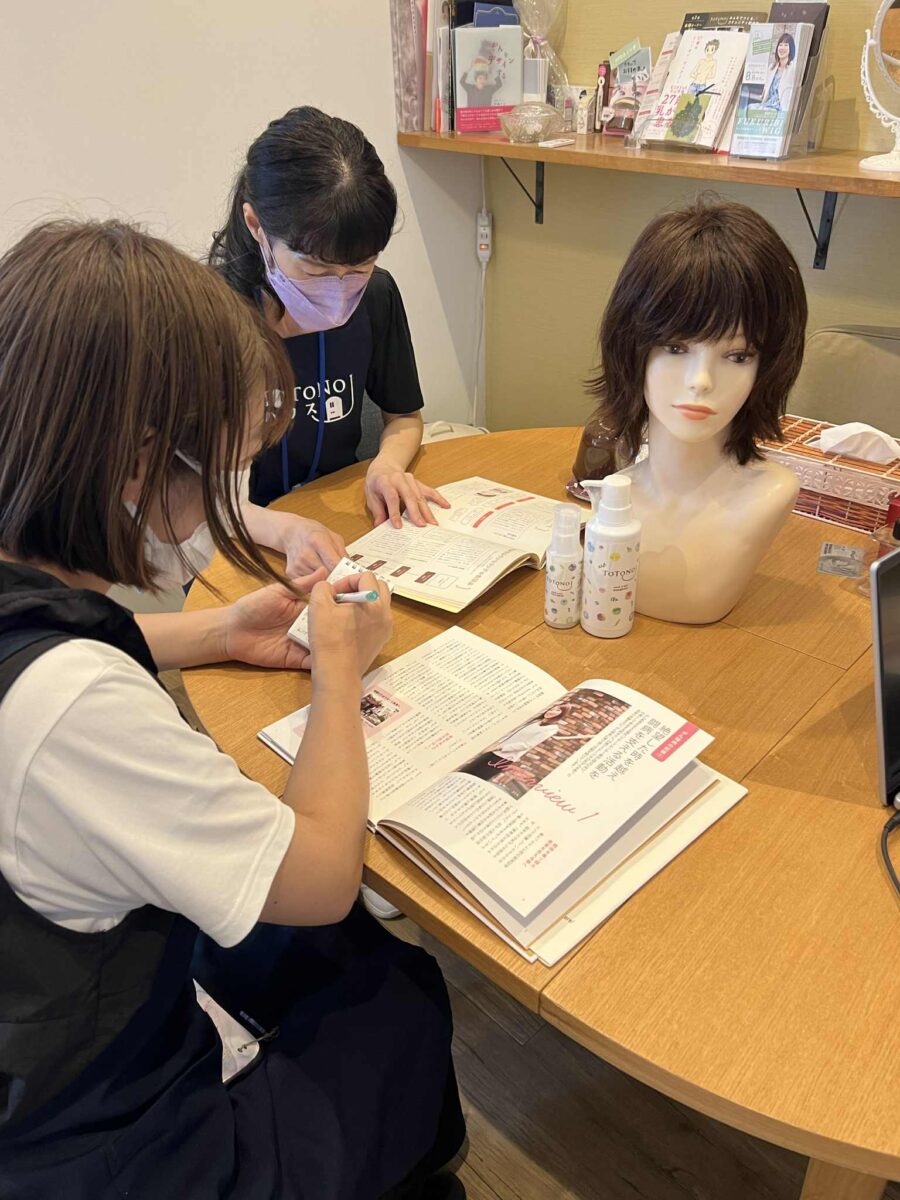 今回の研修では、スタッフが実際にウィッグを試着してその使い心地を体験しました。自分の体で感じることで、髪の変化やウィッグの悩みをより身近に理解でき、患者さん一人ひとりに寄り添ったサポートにつなげられます。