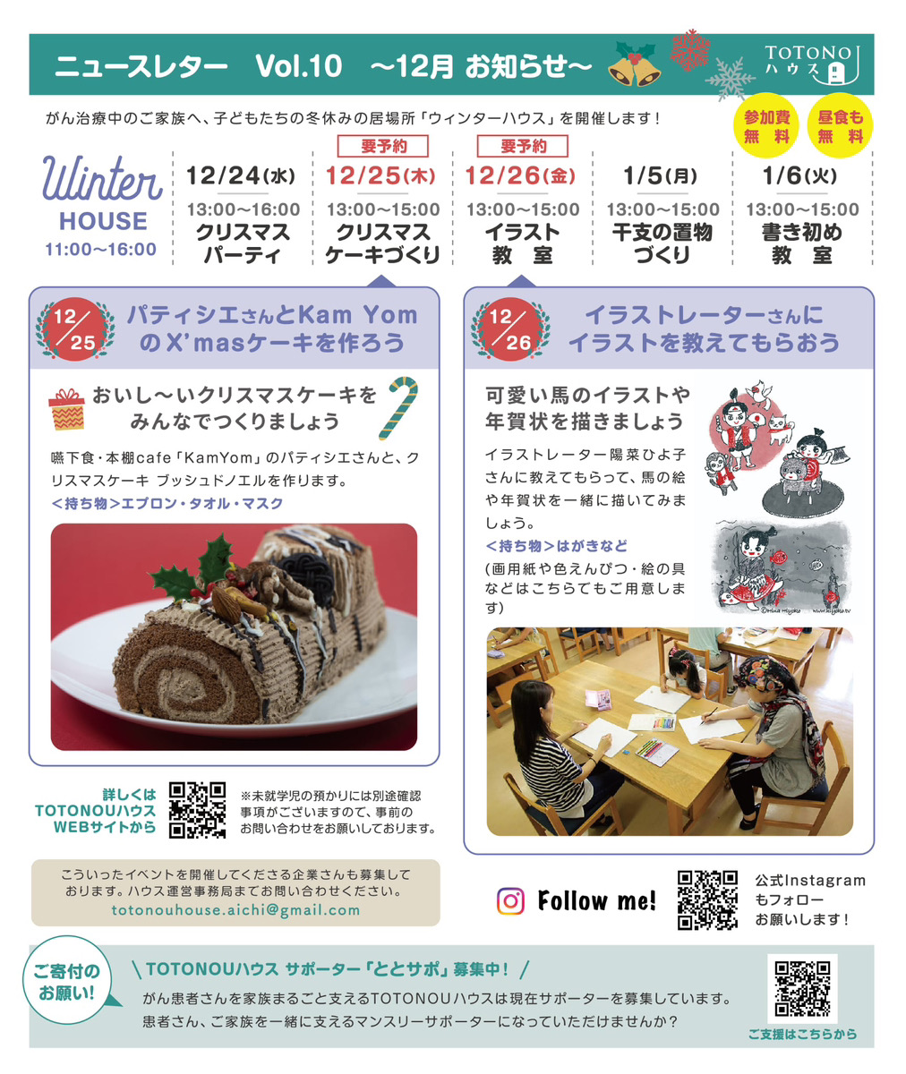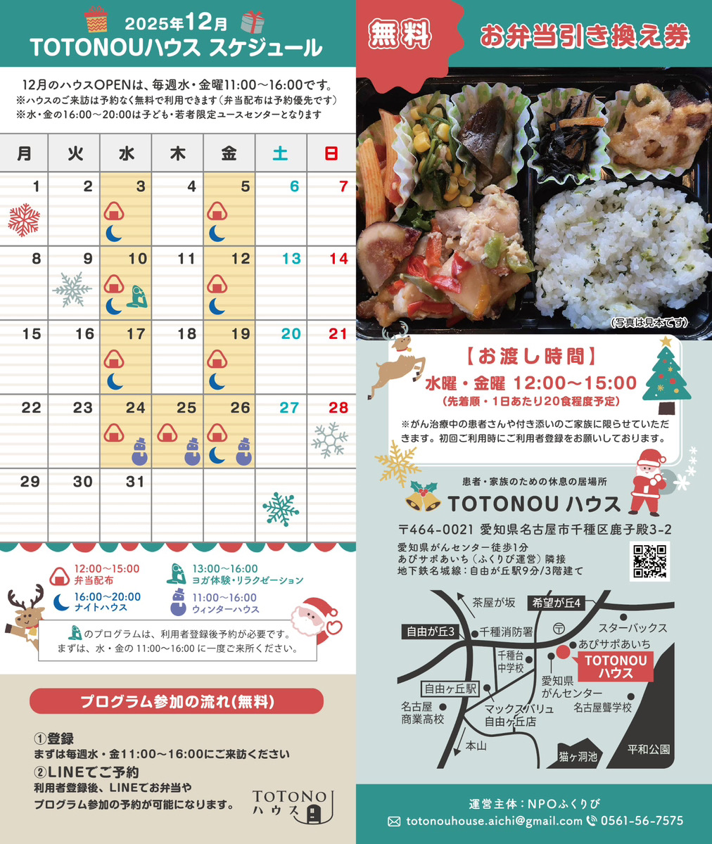 12月のTOTONOUハウスでは、水曜日と金曜日11:00〜16:00のオープンに加え、12/25の木曜日も開所します。