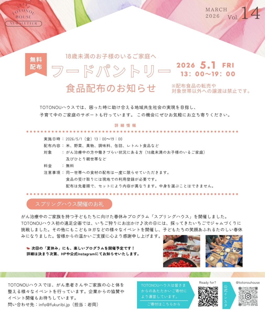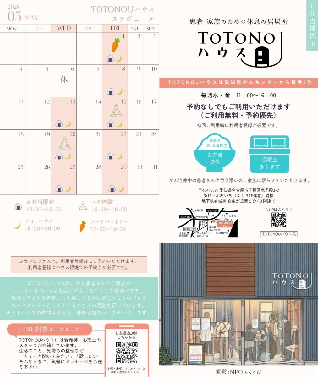 患者さんとご家族のための休息の居場所「TOTONOUハウス」より5月のスケジュールをお知らせします。